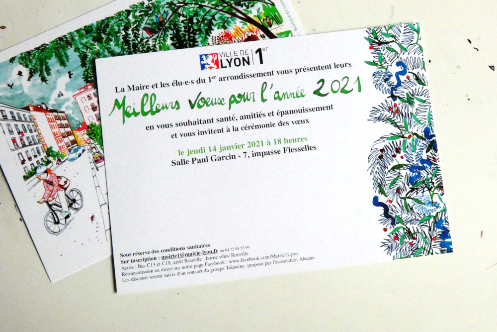 Après un travail de mise en page, de graphisme, puis l’impression réalisée par mon imprimeur habituel A3 print sur Lyon 1er, les cartes de vœux sont là ! C’est la première fois qu’un de mes dessins est imprimé en aussi grande série et diffusé auprès d’un public aussi large. C’est vraiment quelque chose d’à la fois très intimidant et très valorisant !