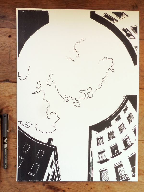[Spoiler] Je dessine d’après photo. C’est un énorme travail en amont. Je ne veux en aucun cas utiliser les photos d’autres personnes ! Pour des raisons éthiques de droits à l’image déjà mais surtout pour choisir mes propres sujets et cadrages. Cela me permet de pourvoir dessiner tranquille à l’atelier après. Pour que le passage à la sérigraphie soit simple je travaille à l’encre noire, à la plume ou au stylo.